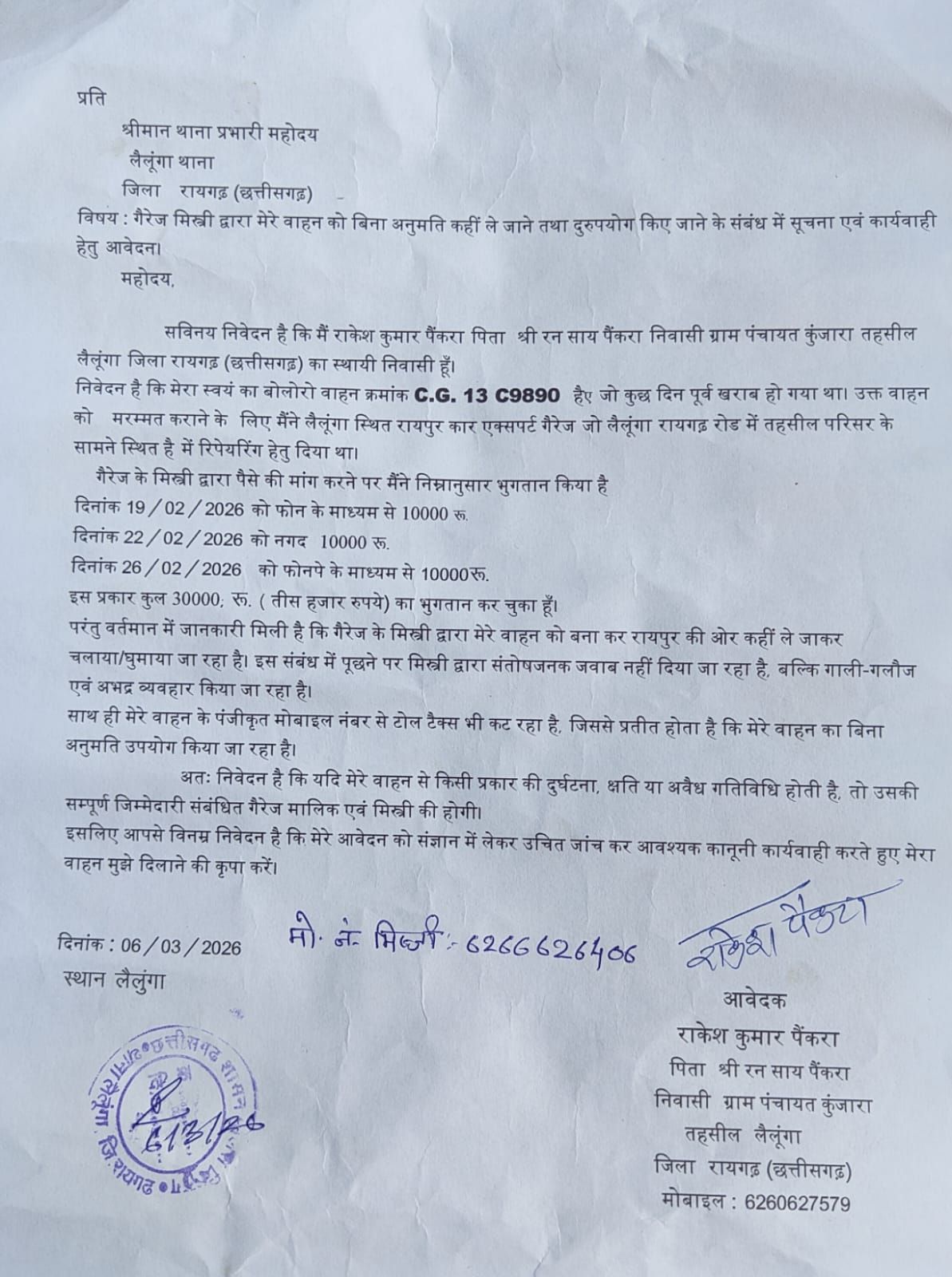 рдкреНрд░рд╛рдкреНрдд рдЬрд╛рдирдХрд╛рд░реА рдХреЗ рдЕрдиреБрд╕рд╛рд░ рдЧреНрд░рд╛рдо рдкрдВрдЪрд╛рдпрдд рдХреБрдВрдЬрд╛рд░рд╛ рдирд┐рд╡рд╛рд╕реА рд░рд╛рдХреЗрд╢ рдХреБрдорд╛рд░ рдкреИрдВрдХрд░рд╛ рдиреЗ рдЕрдкрдиреЗ рдмреЛрд▓реЗрд░реЛ рд╡рд╛рд╣рди рдХреНрд░рдорд╛рдВрдХ CG 13 C 9890 рдХреЛ рдЦрд░рд╛рдм рд╣реЛрдиреЗ рдХреЗ рдХрд╛рд░рдг рд▓реИрд▓реВрдВрдЧрд╛ рд╕реНрдерд┐рдд рд░рд╛рдпрдкреБрд░ рдХрд╛рд░ рдПрдХреНрд╕рдкрд░реНрдЯ рдЧреИрд░реЗрдЬ рдореЗрдВ рдорд░рдореНрдордд рдХреЗ рд▓рд┐рдП рджрд┐рдпрд╛ рдерд╛ред рдпрд╣ рдЧреИрд░реЗрдЬ рд▓реИрд▓реВрдВрдЧрд╛-рд░рд╛рдпрдЧрдврд╝ рдореБрдЦреНрдп рдорд╛рд░реНрдЧ рдкрд░ рддрд╣рд╕реАрд▓ рдкрд░рд┐рд╕рд░ рдХреЗ рд╕рд╛рдордиреЗ рд╕реНрдерд┐рдд рд╣реИред рд╡рд╛рд╣рди рдорд╛рд▓рд┐рдХ рдХрд╛ рдЖрд░реЛрдк рд╣реИ рдХрд┐ рдЧреИрд░реЗрдЬ рдорд┐рд╕реНрддреНрд░реА рджреНрд╡рд╛рд░рд╛ рдмрд╛рд░-рдмрд╛рд░ рдкреИрд╕реЗ рдХреА рдорд╛рдВрдЧ рдХреА рдЧрдИ, рдЬрд┐рд╕ рдкрд░ рдЙрдиреНрд╣реЛрдВрдиреЗ рдЕрд▓рдЧ-рдЕрд▓рдЧ рддрд┐рдерд┐рдпреЛрдВ рдореЗрдВ рдХреБрд▓ 30 рд╣рдЬрд╛рд░ рд░реБрдкрдпреЗ рдХрд╛ рднреБрдЧрддрд╛рди рдХрд┐рдпрд╛ред