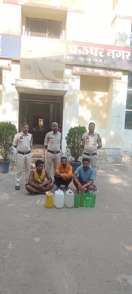 рдЖрдЬ рджрд┐рдирд╛рдВрдХ 01.04.2026 рдХреЛ рдерд╛рдирд╛ рдЪрдХреНрд░рдзрд░рдирдЧрд░ рдкреБрд▓рд┐рд╕ рджреНрд╡рд╛рд░рд╛ рдЧреНрд░рд╛рдо рдЬрд╛рдордЧрд╛рдВрд╡ рдХреЛрд▓рд╛рдИрдмрд╣рд╛рд▓ рдореЗрдВ рдЕрд▓рдЧ-рдЕрд▓рдЧ рд╕реНрдерд╛рдиреЛрдВ рдкрд░ рд░реЗрдб рдХрд╛рд░реНрд░рд╡рд╛рдИ рдХрд░ рддреАрди рдЖрд░реЛрдкрд┐рдпреЛрдВ рдХреЛ рдЧрд┐рд░рдлреНрддрд╛рд░ рдХрд┐рдпрд╛ рдЧрдпрд╛ред рдЖрд░реЛрдкреА рдкреНрд░реЗрдо рдХреБрдорд╛рд░ рдХрд┐рд╕рд╛рди (42 рд╡рд░реНрд╖) рдХреЗ рдХрдмреНрдЬреЗ рд╕реЗ 12 рд▓реАрдЯрд░, рдЪрдВрджреНрд░рд┐рдХрд╛ рдкреНрд░рд╕рд╛рдж рд╕реЛрдирд╡рд╛рдиреА (34 рд╡рд░реНрд╖) рд╕реЗ 11 рд▓реАрдЯрд░ рддрдерд╛ рд╢рд┐рд╡рд╛ рдХрд┐рд╕рд╛рди (28 рд╡рд░реНрд╖) рд╕реЗ 12 рд▓реАрдЯрд░ рдХрдЪреНрдЪреА рдорд╣реБрдЖ рд╢рд░рд╛рдм рдЬрдмреНрдд рдХреА рдЧрдИред рдХреБрд▓ рдорд┐рд▓рд╛рдХрд░ 35 рд▓реАрдЯрд░ рдЕрд╡реИрдз рдорд╣реБрдЖ рд╢рд░рд╛рдм рдХреА рдмрд░рд╛рдорджрдЧреА рд╣реБрдИ рд╣реИред рдЖрд░реЛрдкрд┐рдпреЛрдВ рдкрд░ рдерд╛рдирд╛ рдЪрдХреНрд░рдзрд░рдирдЧрд░ рдореЗрдВ рдзрд╛рд░рд╛ 34-2, 59-рдХ рдЖрдмрдХрд╛рд░реА рдПрдХреНрдЯ рдХреЗ рддрд╣рдд рдХрд╛рд░реНрд░рд╡рд╛рдИ рдХрд░ рд░рд┐рдорд╛рдВрдб рдкрд░ рднреЗрдЬрд╛ рдЧрдпрд╛ рд╣реИ ред рдЪрдХреНрд░рдзрд░рдирдЧрд░ рд╢рд░рд╛рдм рд░реЗрдб рдХрд╛рд░реНрдпрд╡рд╛рд╣реА рдореЗрдВ рдкреНрд░рдзрд╛рди рдЖрд░рдХреНрд╖рдХ рд╕рдВрдЬрдп рддрд┐рд╡рд╛рд░реА, рд░рд╡рд┐ рдХрд┐рд╢реЛрд░ рд╕рд╛рдп, рдЖрд░рдХреНрд╖рдХ рд╢реНрд╡реЗрдд рдмрд╛рд░рд┐рдХ, рдирд╛рд░рд╛рдпрдг рд╕рд┐рдВрд╣ рд░рд╛рдард┐рдпрд╛, рдордиреЛрд╣рд░ рдорд┐рдВрдЬ рдФрд░ рд╕реБрд╢реАрд▓ рдорд┐рдВрдЬ рд╢рд╛рдорд┐рд▓ рдереЗ ред