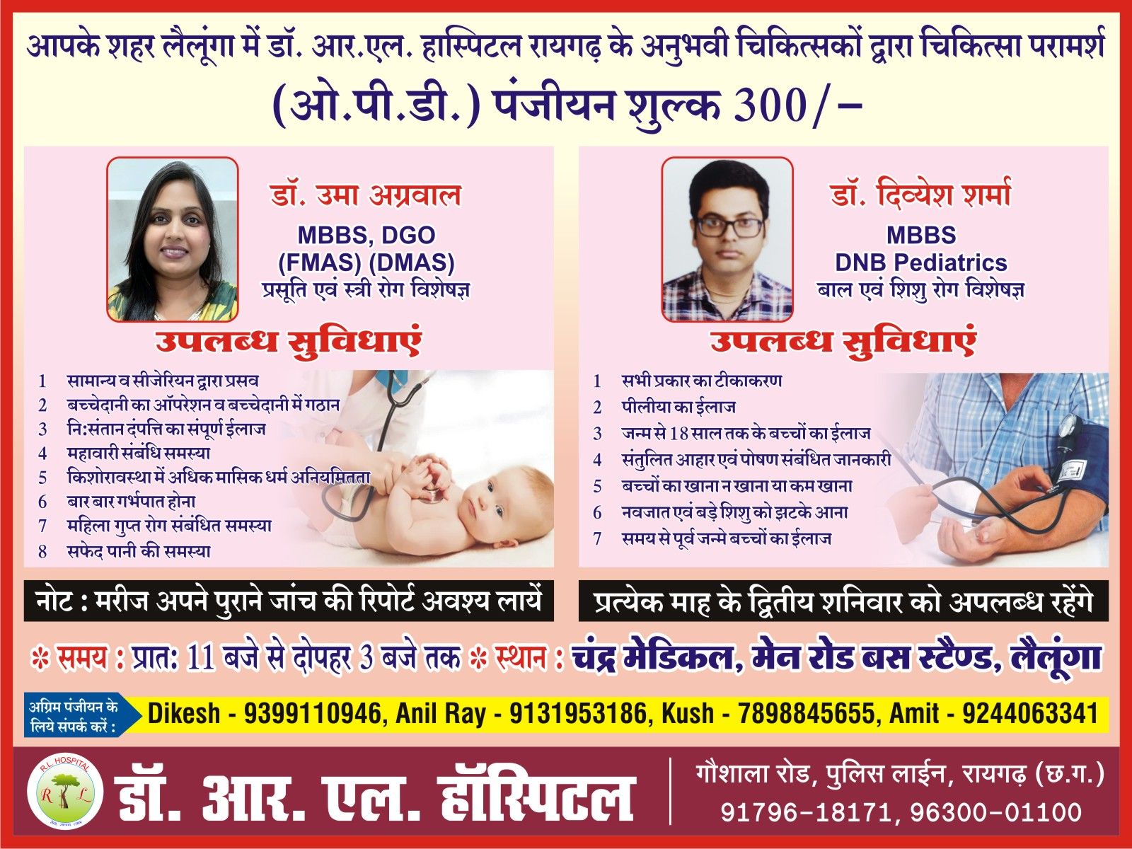 рдЗрд╕ рд╡рд┐рд╢реЗрд╖ рдУрдкреАрдбреА рдореЗрдВ рд░рд╛рдпрдЧрдврд╝ рдХреЗ рдЬрд╛рдиреЗ-рдорд╛рдиреЗ рдЪрд┐рдХрд┐рддреНрд╕рдХ, рдкреНрд░рд╕реВрддрд┐ рдПрд╡рдВ рд╕реНрддреНрд░реА рд░реЛрдЧ рд╡рд┐рд╢реЗрд╖рдЬреНрдЮ рдбреЙ. рдЙрдорд╛ рдЕрдЧреНрд░рд╡рд╛рд▓ (MBBS, DGO, FMAS, DMAS) рддрдерд╛ рдмрд╛рд▓ рдПрд╡рдВ рд╢рд┐рд╢реБ рд░реЛрдЧ рд╡рд┐рд╢реЗрд╖рдЬреНрдЮ рдбреЙ. рджрд┐рд╡реНрдпреЗрд╢ рд╢рд░реНрдорд╛ (MBBS, DNB Pediatrics) рдЕрдкрдиреА рд╕реЗрд╡рд╛рдПрдВ рджреЗрдВрдЧреАред рдпрд╣ рдЕрд╡рд╕рд░ рдЦрд╛рд╕ рдЗрд╕рд▓рд┐рдП рднреА рд╣реИ рдХреНрдпреЛрдВрдХрд┐ рдЧреНрд░рд╛рдореАрдг рдФрд░ рдЕрдВрдЪрд▓ рдХреЗ рдорд░реАрдЬреЛрдВ рдХреЛ рдмрдбрд╝реЗ рд╢рд╣рд░ рдЬрд╛рдиреЗ рдХреА рдкрд░реЗрд╢рд╛рдиреА, рдЦрд░реНрдЪ рд╡ рд╕рдордп рдХреА рдмрд░реНрдмрд╛рджреА рд╕реЗ рдХрд╛рдлреА рд░рд╛рд╣рдд рдорд┐рд▓реЗрдЧреАред
