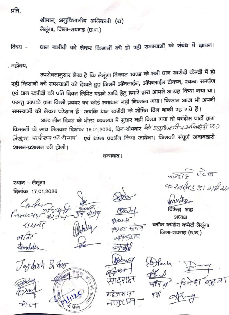 рдмреНрд▓реЙрдХ рдХрд╛рдВрдЧреНрд░реЗрд╕ рдХрдореЗрдЯреА рдЕрдзреНрдпрдХреНрд╖ рд╡реАрд░реЗрдВрджреНрд░ рд╕рд╛рд╣ рдХреЗ рдиреЗрддреГрддреНрд╡ рдореЗрдВ рдХрд╛рдВрдЧреНрд░реЗрд╕ рдХрд╛рд░реНрдпрдХрд░реНрддрд╛рдУрдВ рдиреЗ рдпрд╣ рдЬреНрдЮрд╛рдкрди рд╕реМрдВрдкрддреЗ рд╣реБрдП рд╕реНрдкрд╖реНрдЯ рдЪреЗрддрд╛рд╡рдиреА рджреА рд╣реИ рдХрд┐ рдпрджрд┐ рддреАрди рджрд┐рд╡рд╕ рдХреЗ рднреАрддрд░ рдзрд╛рди рдЦрд░реАрджреА рд╡реНрдпрд╡рд╕реНрдерд╛ рдореЗрдВ рд╕реБрдзрд╛рд░ рдирд╣реАрдВ рд╣реБрдЖ, рддреЛ рдХрд╛рдВрдЧреНрд░реЗрд╕ рдкрд╛рд░реНрдЯреА рдХрд┐рд╕рд╛рдиреЛрдВ рдХреЗ рд╕рд╛рде рдорд┐рд▓рдХрд░ рджрд┐рдирд╛рдВрдХ 19 рдЬрдирд╡рд░реА 2026, рд╕реЛрдорд╡рд╛рд░ рдХреЛ рдЕрдиреБрд╡рд┐рднрд╛рдЧреАрдп рдЕрдзрд┐рдХрд╛рд░реА (рд░рд╛.) рд▓реИрд▓реВрдВрдЧрд╛ рдХрд╛рд░реНрдпрд╛рд▓рдп рдХрд╛ рдШреЗрд░рд╛рд╡ рдПрд╡рдВ рдзрд░рдирд╛ рдкреНрд░рджрд░реНрд╢рди рдХрд░реЗрдЧреАред