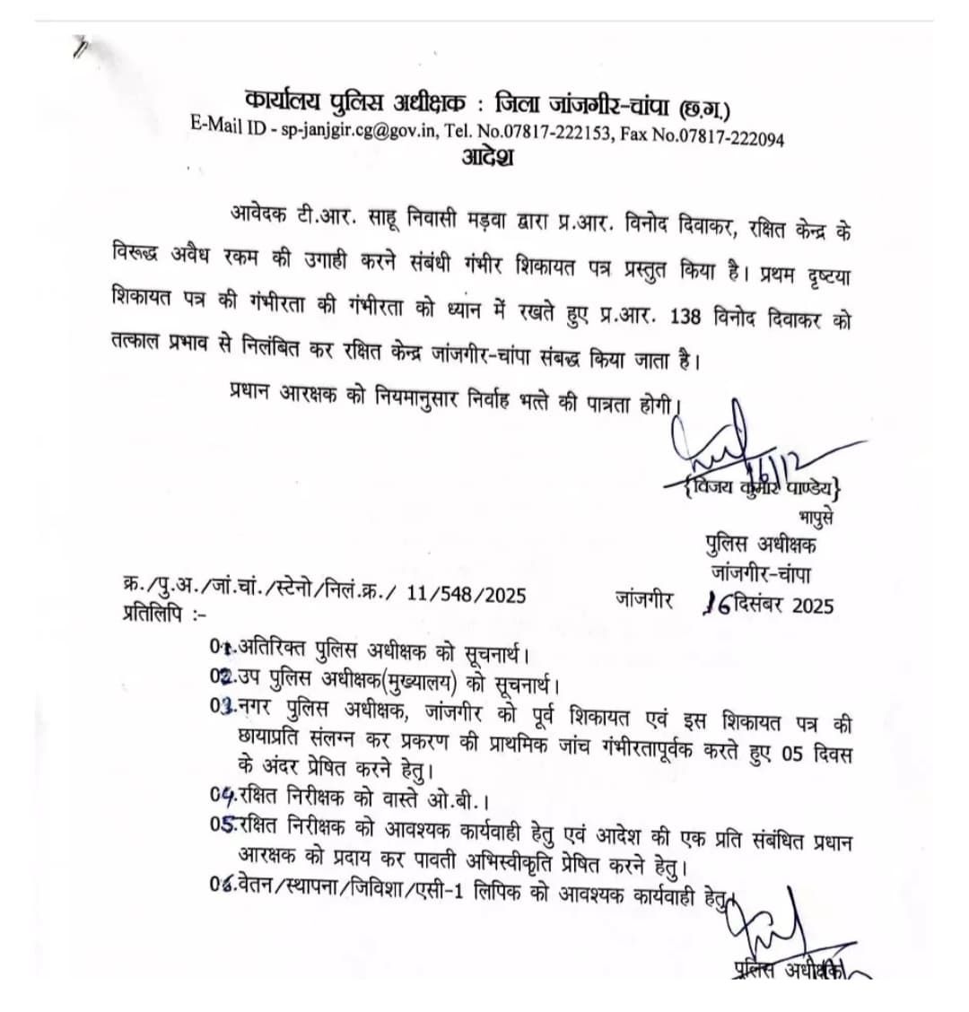 рдкрддреНрд░ рдореЗрдВ рд▓рдЧрд╛рдП рдЧрдП рдЖрд░реЛрдк рдЗрддрдиреЗ рдЧрдВрднреАрд░ рдФрд░ рдЪреМрдВрдХрд╛рдиреЗ рд╡рд╛рд▓реЗ рд╣реИрдВ рдХрд┐ рдкреНрд░рдердо рджреГрд╖реНрдЯрдпрд╛ рд╣реА рдкреБрд▓рд┐рд╕ рдЕрдзреАрдХреНрд╖рдХ рдХреЛ рд╕рдЦреНрдд рдХрджрдо рдЙрдард╛рдиреЗ рдкрд░ рдордЬрдмреВрд░ рд╣реЛрдирд╛ рдкрдбрд╝рд╛ред рдЖрджреЗрд╢ рдореЗрдВ рд╕реНрдкрд╖реНрдЯ рдЙрд▓реНрд▓реЗрдЦ рд╣реИ рдХрд┐ рд╢рд┐рдХрд╛рдпрдд рдХреА рдЧрдВрднреАрд░рддрд╛ рдХреЛ рджреГрд╖реНрдЯрд┐рдЧрдд рд░рдЦрддреЗ рд╣реБрдП рдкреНрд░рдзрд╛рди рдЖрд░рдХреНрд╖рдХ рдХреЛ рддрддреНрдХрд╛рд▓ рдирд┐рд▓рдВрдмрд┐рдд рдХрд░ рд░рдХреНрд╖рд┐рдд рдХреЗрдВрджреНрд░ рдЬрд╛рдВрдЬрдЧреАрд░-рдЪрд╛рдВрдкрд╛ рд╕реЗ рд╕рдВрдмрджреНрдз рдХрд┐рдпрд╛ рдЧрдпрд╛ рд╣реИред рдирд┐рд▓рдВрдмрди рдЕрд╡рдзрд┐ рдореЗрдВ рдЙрдиреНрд╣реЗрдВ рдирд┐рдпрдорд╛рдиреБрд╕рд╛рд░ рдирд┐рд░реНрд╡рд╛рд╣ рднрддреНрддреЗ рдХреА рдкрд╛рддреНрд░рддрд╛ рджреА рдЬрд╛рдПрдЧреАред
